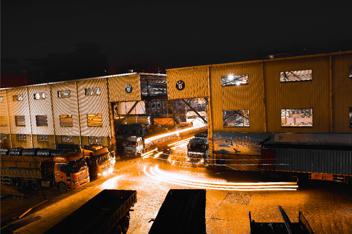 明海鑫專業(yè)鋼材交易市場,裝貨發(fā)車車水馬龍景象。